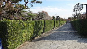 松坂城の裏門跡をでると、石畳に槇垣が美