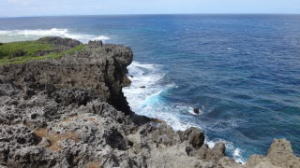 隆起した珊瑚礁の断崖絶壁に打ち寄せる波
